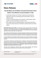 - Hyundai Motor Company and TVS Motor Company sign Joint Development Agreement to deliver and commercialize electric three-wheelers in India and additional markets