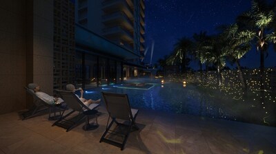 The second-floor infinity pool overlooking the sea features floating luminous orbs and light beams extending into the night sky, shining as though connecting the sky and ocean. Colorful, dynamic illuminations infuse the winter night with a sense of exhilaration.