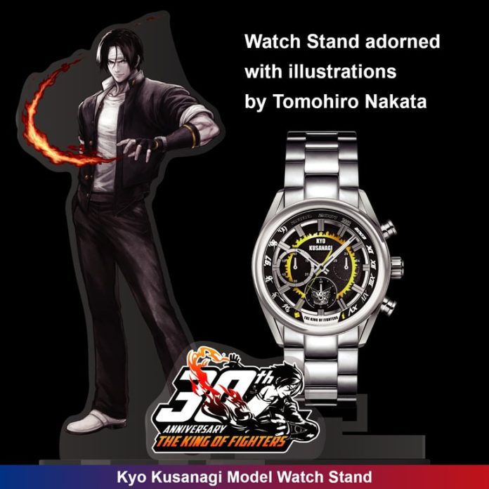 A special watch stand utilizing illustrations of Kyo Kusanagi and Iori Yagami wearing the watches.