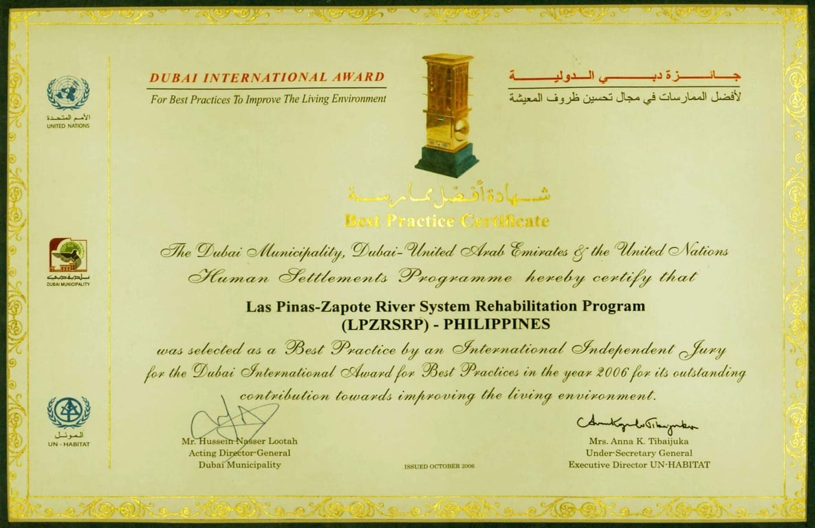 7. Energy Globe Award “Certificate of Honor” recognizing the Las Piñas Kitchen Waste Composting Project as one of the World’s Best Environmental Projects, part of the Sagip Ilog and River Rehabilitation Programs (2002)