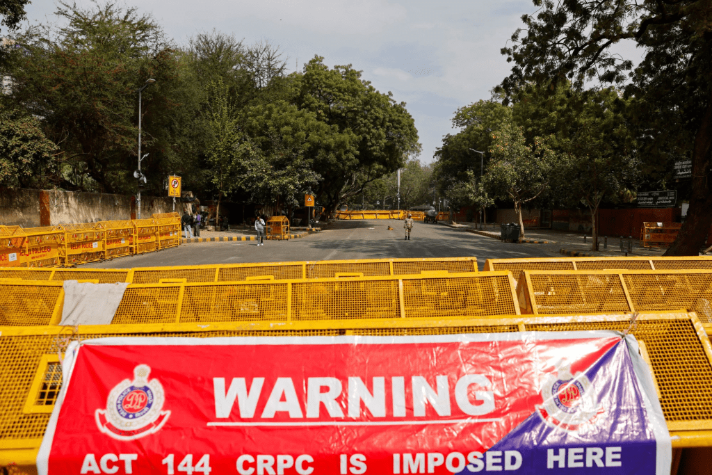 A security personnel stands guard near barricades on a road in Jantar Mantar, India, to stop a protest called by farmers who are marching towards New Delhi to press for the better crop prices promised to them in 2021, on Wednesday. Photo: Reuters