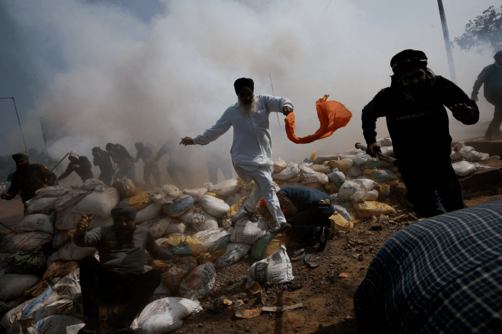 Farmers, who are marching towards New Delhi to press for better crop prices, run for cover amid tear gas fired by police to disperse them at Shambhu barrier, a border crossing between Punjab and Haryana states, India, on February 21. Photo: Reuters