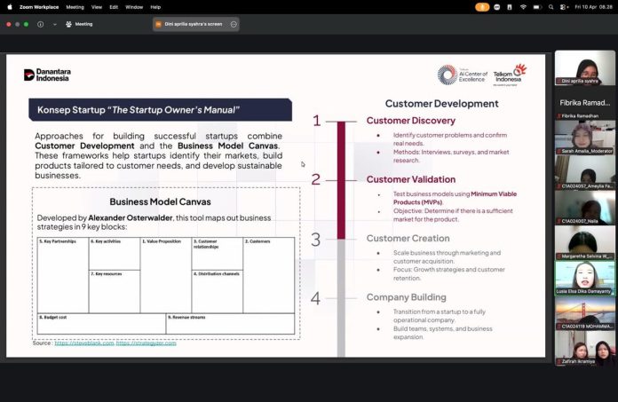 Sesi materi dibawakan oleh Lusia Elsa Dika Damayanty, Business and Community Lead Telkom AI Connect Bandung, yang menghadirkan perspektif technopreneurship berbasis AI. Dalam pemaparannya, Lusia mengangkat konsep startup yang merujuk pada pemikiran Steve Blank, bahwa inti dari sebuah startup bukan terletak pada produk, melainkan pada customer needs. Mahasiswa diajak memahami bahwa secanggih apapun teknologi yang digunakan, nilainya akan rendah apabila tidak berangkat dari kebutuhan nyata pengguna. Konsep ini menjadi landasan penting dalam memanfaatkan AI, di mana inovasi harus dimulai dari problem yang tervalidasi, bukan sekadar eksplorasi teknologi.