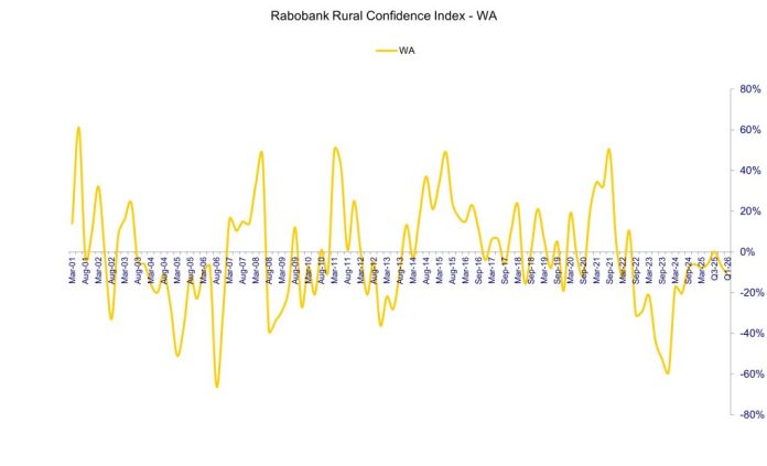 The quarter one Rabobank Rural Confidence Survey found WA farmer sentiment had softened even before the start of the Iran War, with net rural confidence easing from -7 per cent in late 2025 to sit at -11 per cent.