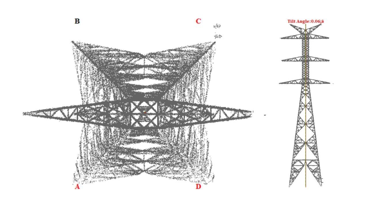 Data point cloud dari Zenmuse L3 diolah di LiPowerline untuk memeriksa apakah posisi menara masih sejajar dengan garis referensinya.
