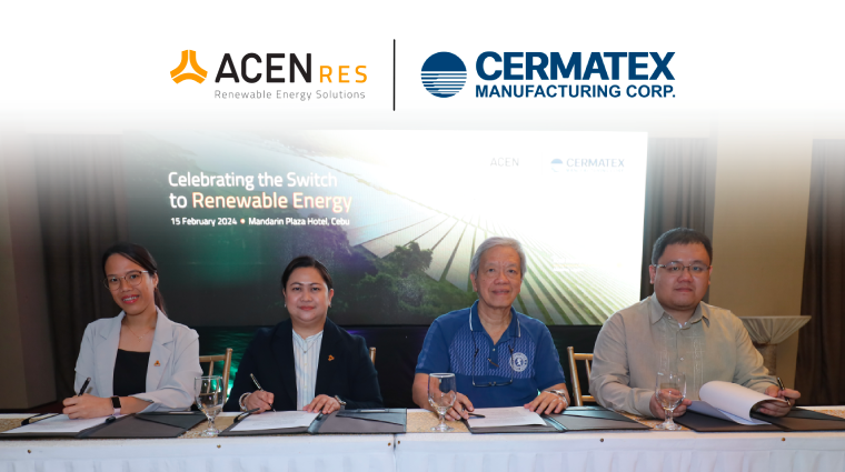 MANILA, Philippines, April 3, 2024 /PRNewswire/ — ACEN Renewable Energy Solutions (ACEN RES), the retail electricity supply unit of ACEN, has been selected by Cermatex Manufacturing Corporation, a leading Cebu-based casual footwear manufacturer, to provide renewable energy to their operating plants. This is a significant leap in corporate sustainability as the partnership ensures that Cermatex’s facilities are now powered by a 100% renewable energy mix, aligning with global environmental targets and responding to the growing consumer demand for responsibly produced goods.