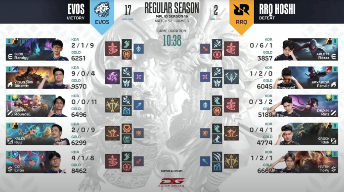 RRQ Hoshi sempat unggul lebih dulu di game pertama lewat permainan disiplin dan objektif. Namun, EVOS menunjukkan mental baja dengan comeback luar biasa di game kedua dan ketiga.