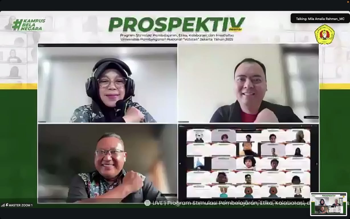 Jakarta – Sebanyak 4.582 mahasiswa baru dari seluruh fakultas Universitas Pembangunan Nasional “Veteran” Jakarta berkumpul secara virtual, Rabu (23/10), untuk mengikuti webinar Critical Thinking dalam rangkaian acara PROSPEKTIV 2025. Sesi ini dibawakan oleh pemateri Jaka Arya Pradana, founder dan CEO sebuah agentic AI startup.