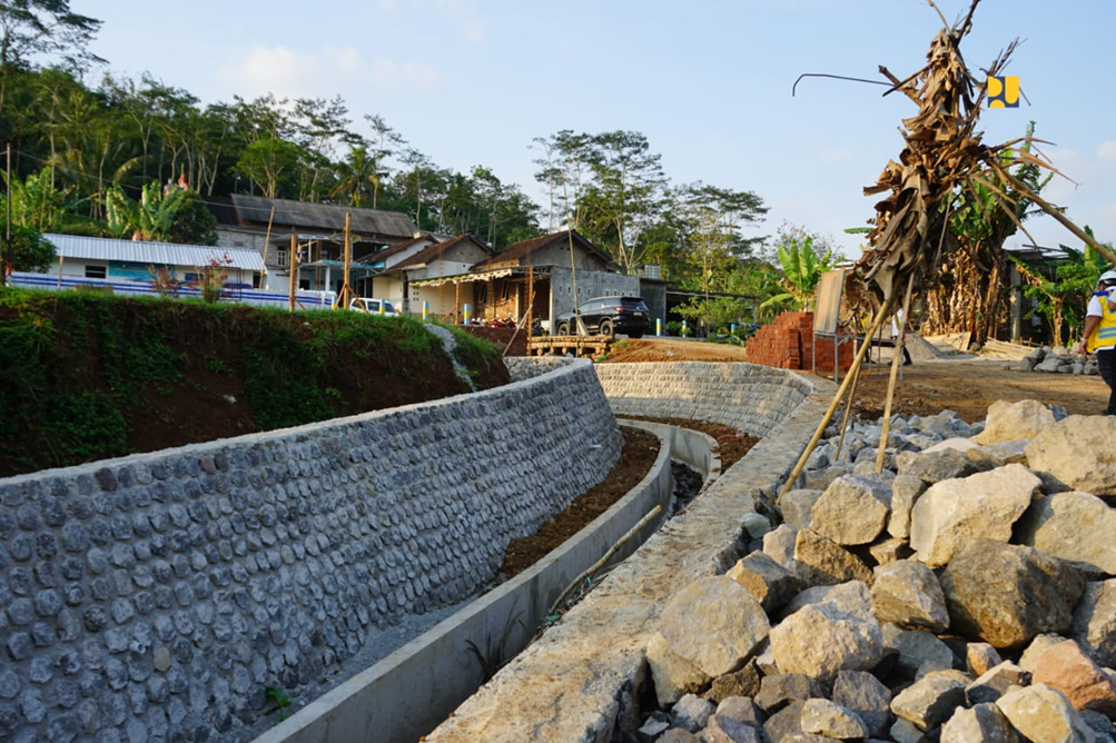 miring sepanjang 85 meter, dinding penahan tanah sepanjang 85 meter, bangunan