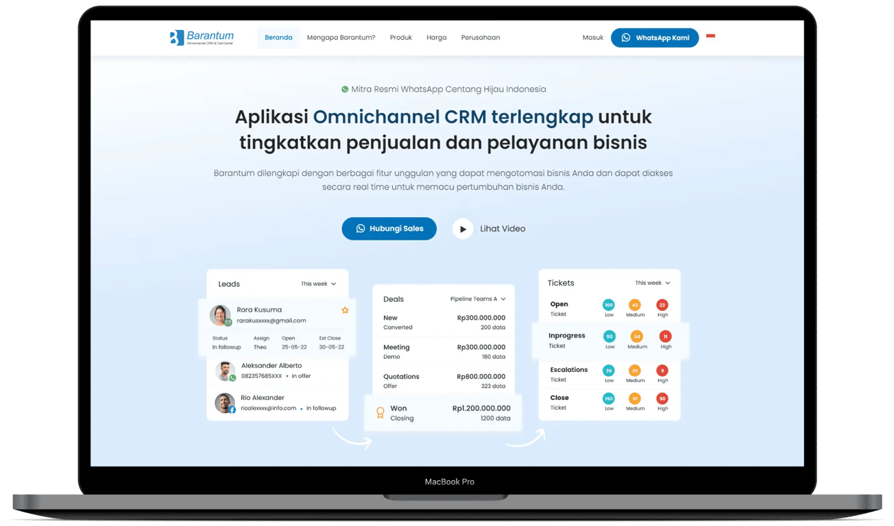 Bayangkan bisnis Anda mampu merespons ratusan pesan pelanggan tanpa ada satu pun yang terlewat. Semua data pelanggan tercatat rapi, tim bisa bekerja lebih efisien, dan pelanggan merasa lebih diperhatikan. Itulah yang ditawarkan oleh Barantum.