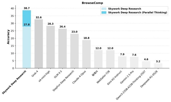 On the authoritative search evaluation benchmark BrowseComp, Skywork Deep Research demonstrates exceptional performance. In standard mode, it already surpasses most competing solutions with an accuracy rate of 27.8%. When activating its proprietary Parallel Thinking mode, the accuracy jumps significantly to 38.7%, setting a new industry SOTA record.