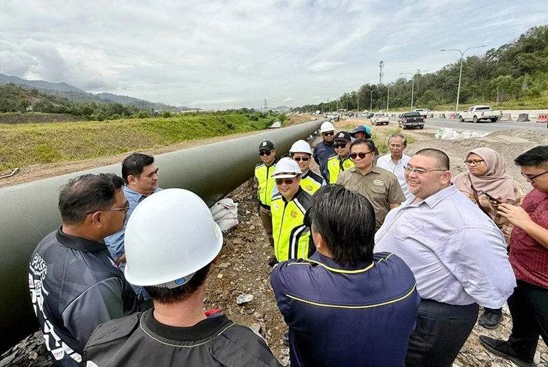 Shahelmey (dua dari kiri) ketika melakukan tinjauan perkembangan kerja pemasangan paip air bagi projek Telibong 2 Fasa 2 (T2P2).