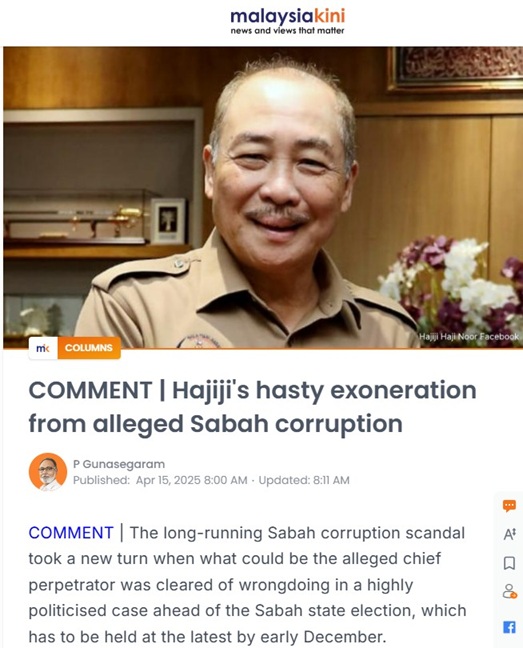 IN his commentary in Malaysiakini, veteran journalist P. Gunasegaram called Sabah Chief Minister Datuk Seri Hajiji Noor’s recent clearance from corruption allegations “hasty”, suggesting that “so many things remain un-investigated.”