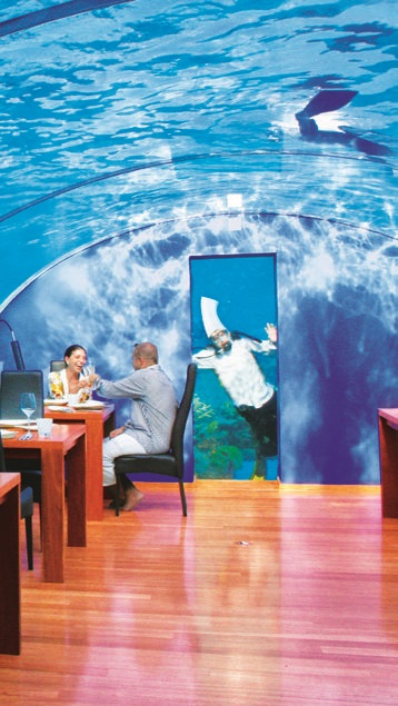 While enjoying their meal, diners can observe a vibrant coral reef life with a myriad of colourful underwater life forms, including a wide variety of reef-dwelling fish. You can also see the giant moray eel and stingrays.