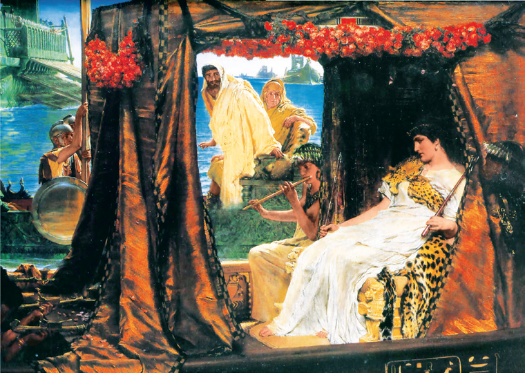 In the beginning, every stolen glance counts. The foundation of love is built upon the first meeting of eyes, searching for the slightest sign of requited adoration. Though she would later be known for bolder personality traits, this reticent Cleopatra shies away from the curious, searching stare of Mark Antony in this painting by Alma-Tadema of their meeting in 41BC. This 1885 depiction captures in its historic setting the first moment of a courtship that led the pair to succumb to the power of their love – in defiance of logic, sense and reason.