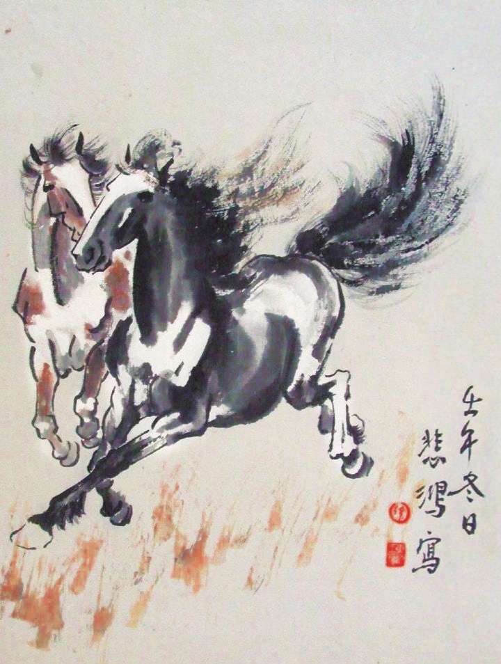 Chinese art – paintings, statues, sculptures – reflect how revered horses were. In this painting by Xu Beihong called Galloping Horses, the artistic strokes capture their grace.