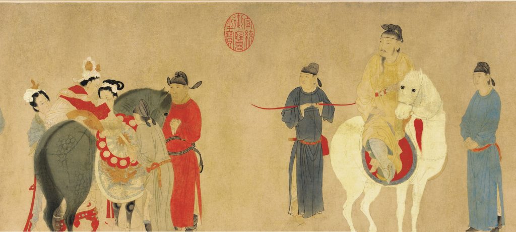 This painting by Li Kung Lin entitled The Lady-Kuo Kuo and Her Sisters depicts the noblewoman after whom it is named, leading a group of her people on horses. The Lady was a leader and a warrior who defended her tribe against its enemies during the Sui Dynasty, and as such, was always seen with her horse – her trusty companion in battle.
