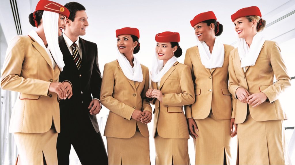 For Emirates, female flight attendants are resplendent in exquisitely detailed khaki suits paired with a red hat and an attractively draped veil. Combining fashion with sheer glam, and the addition of a touch of class and a whole lot of femininity, the attendants turn heads wherever they walk, whether down the aisle or through the airport.