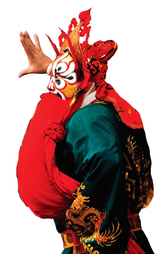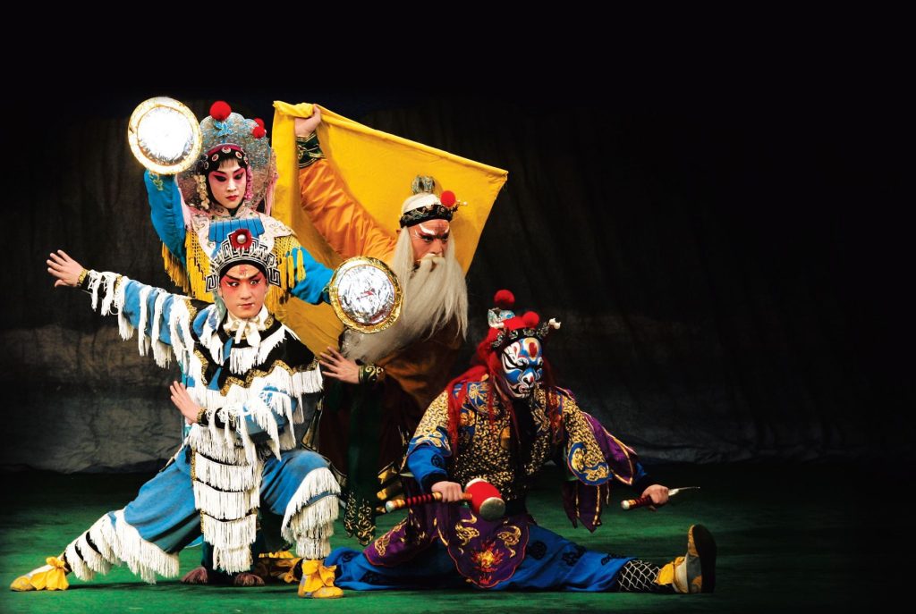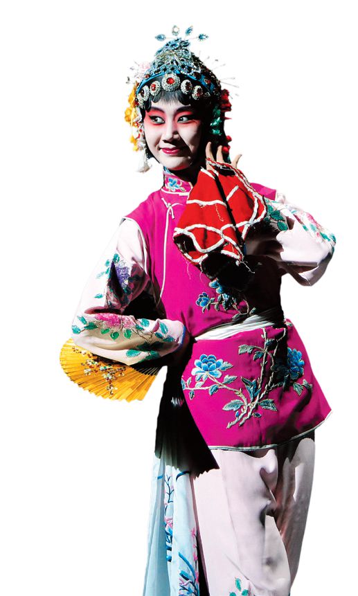 Four distinct outfits underpin the major characters. Male roles are divided into Lao Sheng, an old man either a distinguished official or scholar, Xiao Sheng depicting a young man or warrior in elaborate dress, and Wu Sheng, a man of great physical skill, like an acrobat. The female role has similar divisions, with an elegant woman entitled Qing Yi, a flirtatious female in Hua Dan, a young unwedded girl Gui Men Dan and Dao Ma Dan, a female warrior. Wu Dan is a female acrobat and Lao Dan depicts an old woman. The cast is completed by the forceful Jing, a man with a painted face often playing the part of a high-ranking military man, and Chou, the amusing scoundrel or jester.