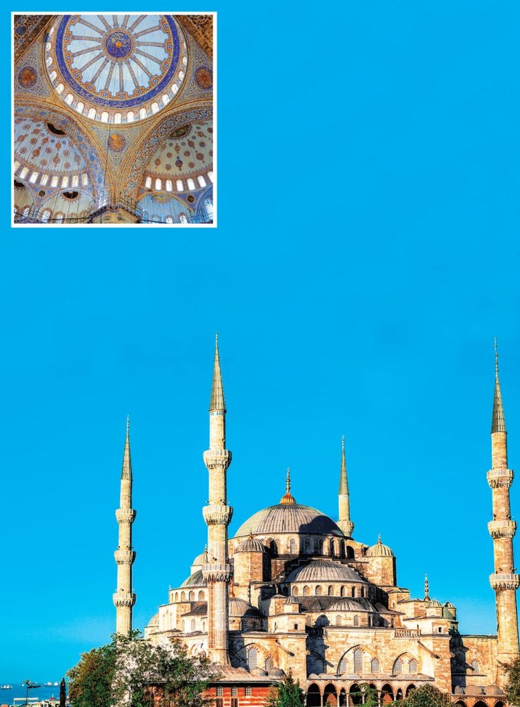 Inset: A view of the ceiling of the Sultan Ahmed Mosque also known as ‘Blue Mosque’ because of over 20,000 handmade ceramic tiles on the roof interior. The tiles are patterned in more than 50 different tulip designs.